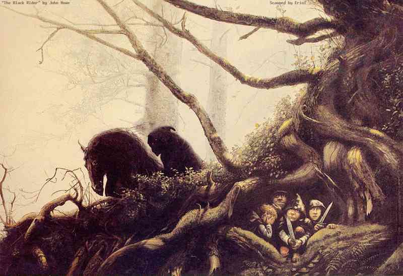 y juntos partieron hacia Bree. En el camino se cruzaron con un misterioso jinete negro que les seguía